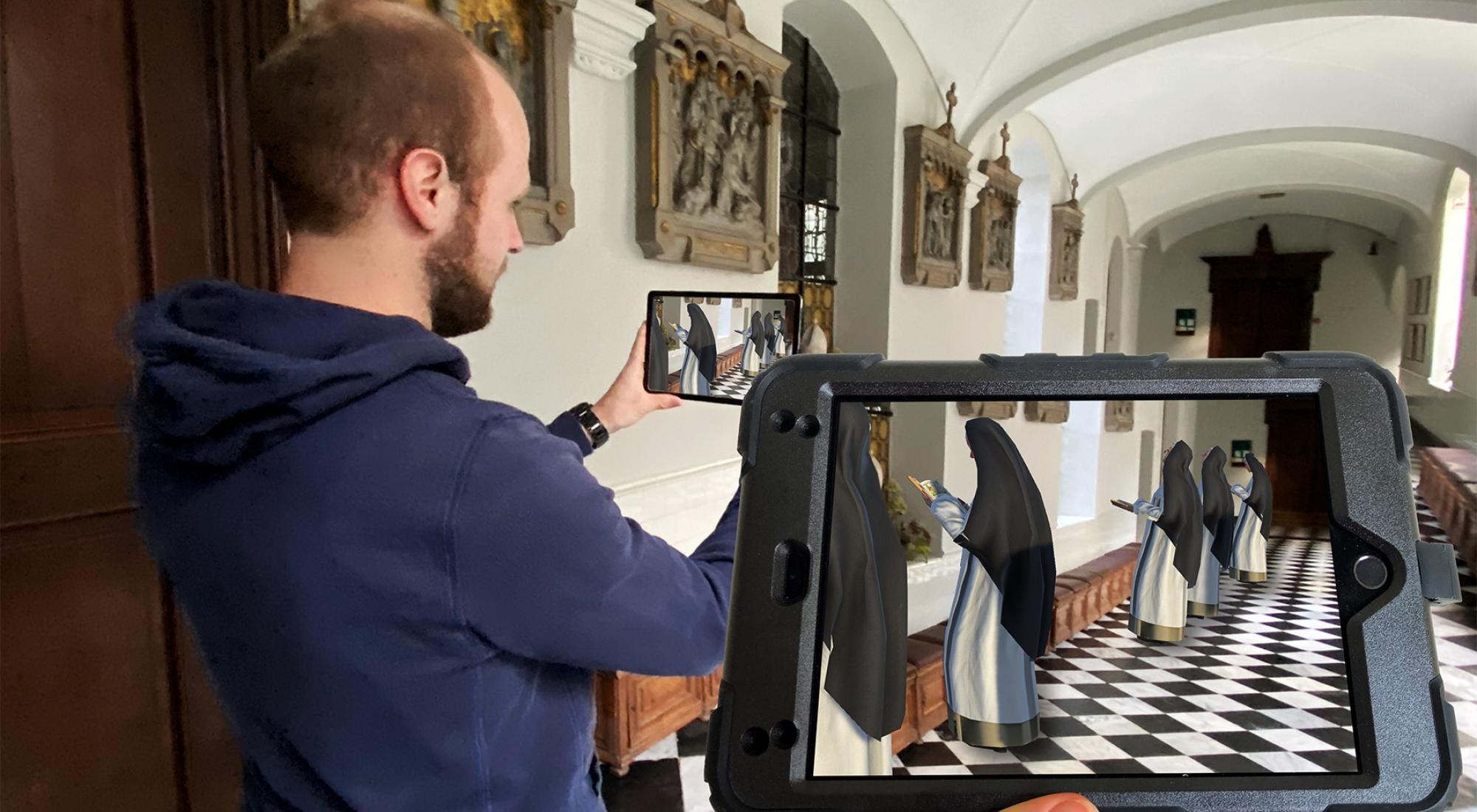 This tablet offers you a unique experience, giving extra information in addition to what the guide will tell to you during your guided visit to this closed convent. Via this tablet, thanks to the magic of AR, you will see at several places in this wonderful building various scenes and activities come alive. For example, by pointing your tablet at an old map of Bruges all the religious buildings in the old city centre will appear in 3D before your very eyes. In the same way, you will be able to follow the evolution of the construction of the convent and you will also be able to leaf - virtually but oh so realistically - through centuries-old manuscripts. The beauty of the convent garden anno 1900 can likewise be admired using this same clever technology. You can browse real manuscripts via AR.